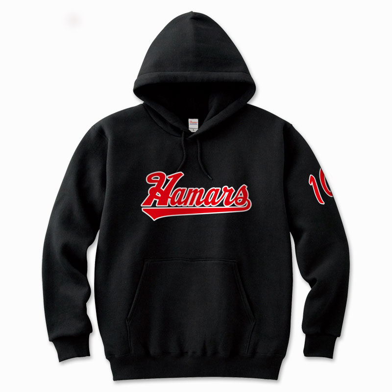パーカーの前面にはサークルロゴをシルク版でプリント、左袖にはそれぞれの番号を転写シートでプリントしています。