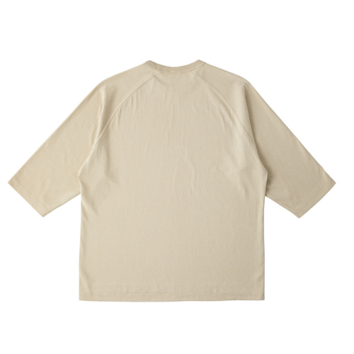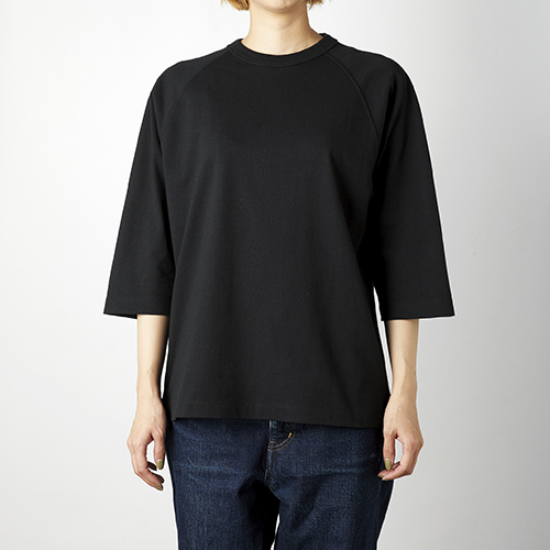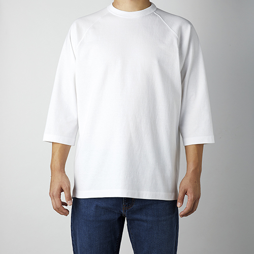 オープンエンド糸を使用したリラックスシルエットのラグラン7分袖Tシャツ。